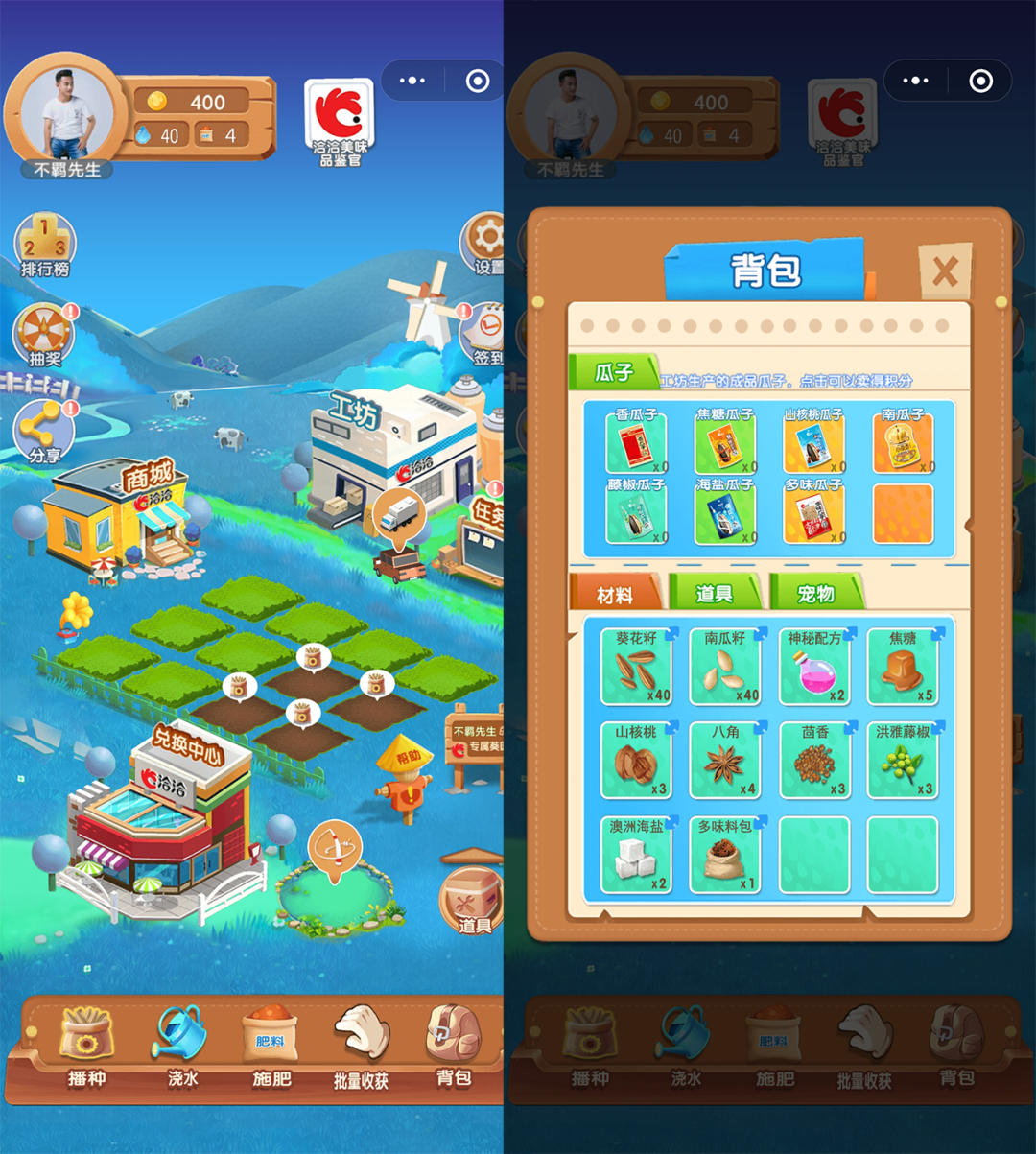 洽洽葵园可以看作是洽洽做用户留存设计的游戏场景,在这个游戏场景里,用户可以将葵花子进行播种、浇水、施肥、批量收获,让用户通过小游戏体验了从一粒种子到制成成品的整个流程,用户还可以在背包中选择想要制作的成品瓜子,比如有香瓜子、焦糖瓜子、山核桃瓜子、南瓜子、藤椒瓜子等等。