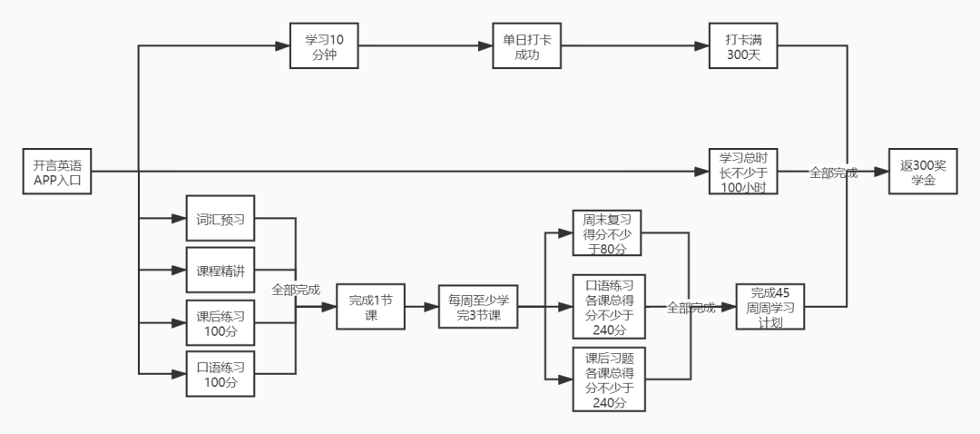 看似只要简单地完成3个任务即可拿到300元奖学金,但实际上是10个任务,3个外显任务+7个隐藏任务。可能是为了增加用户活跃度,同时降低奖学金计划通过率,减少活动预算,所以设置了3+7个任务。