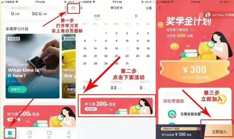 用户最初的触发,是通过成为开言英语年会员后,打开开言英语APP,首页banner图,通过文案"学习得300元"吸引用户。由于瓜分或者奖学金一般都是几十块钱,开言英语这个300元奖学金就会格外吸引用户,驻足多看一下。