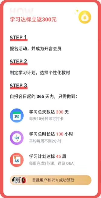 首先用户需要是开言英语的年会员;其次,参与开言测试,定制学习计划,选择个性化教材;第三,从报名日起的365天,需要做到: