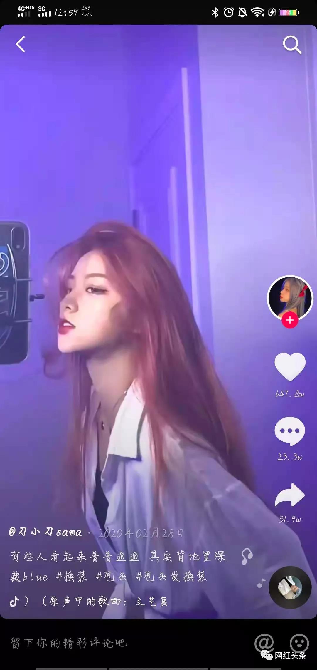 因为在视频里,各个达人都有露出"刀小刀sama"的变装视频,底下也会带有"甩头发换装",也使得她在达人的粉丝里进行了二次传播,促进了刀小刀sama的爆火。