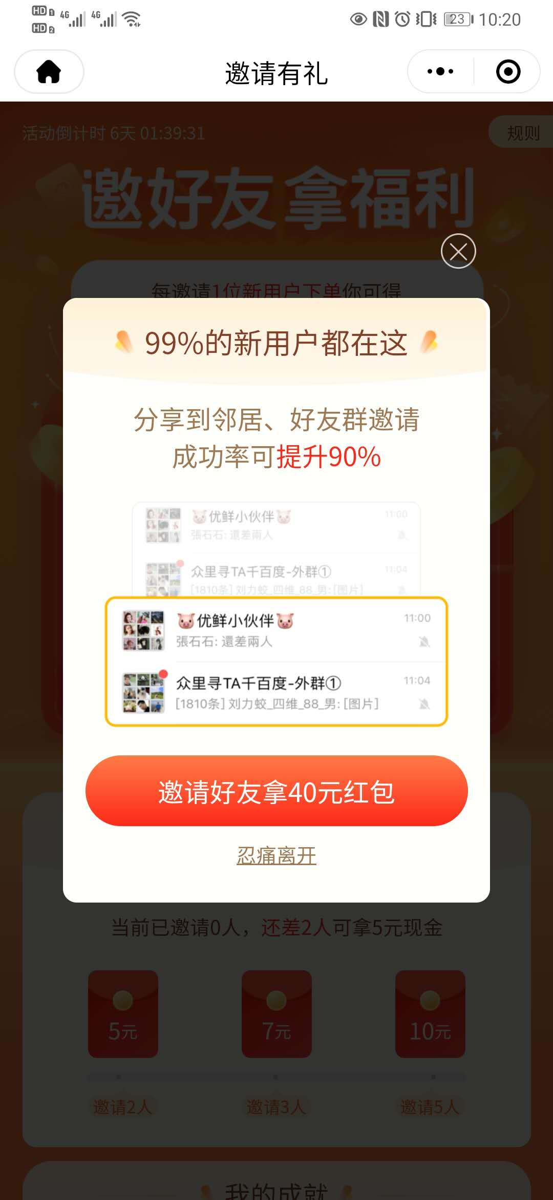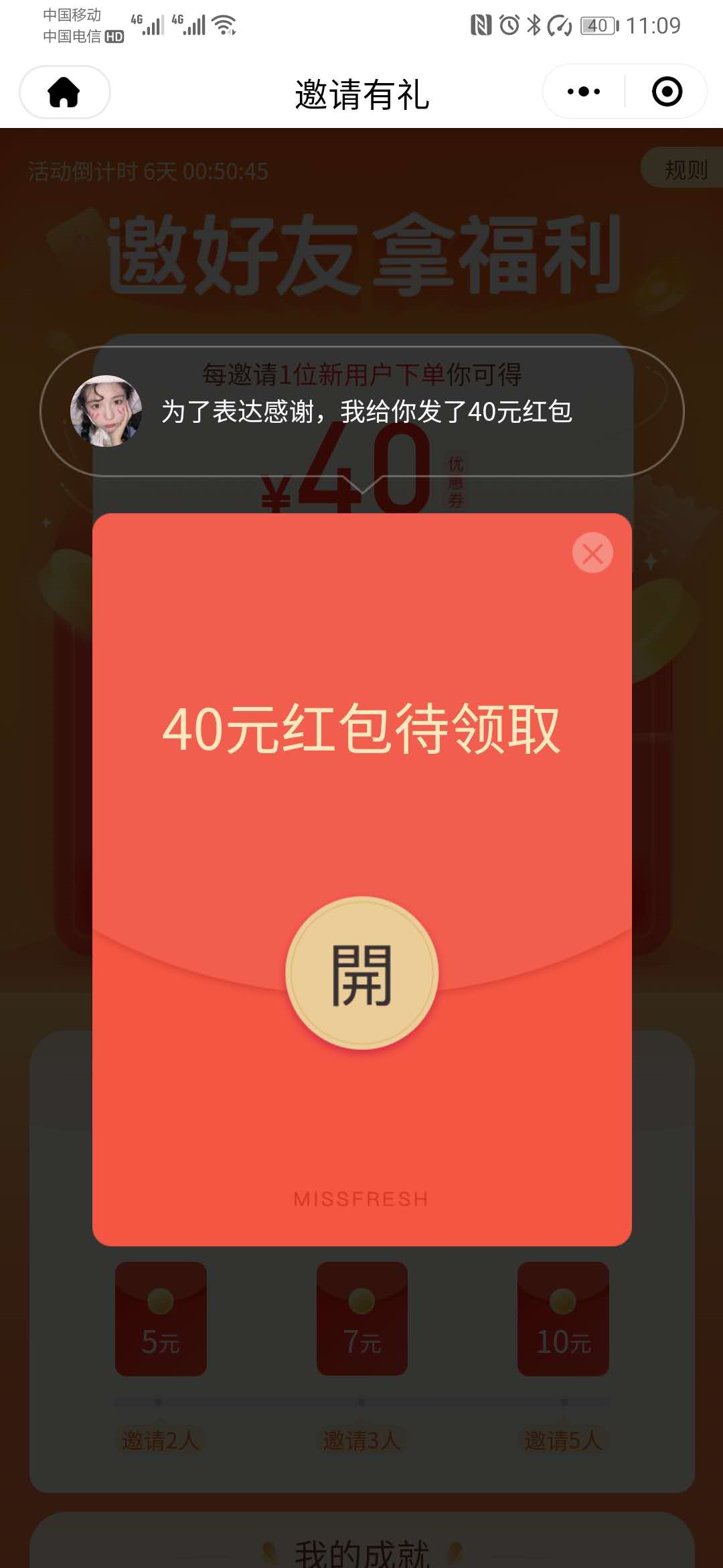 当你开始邀请第一个人的时候,每日优鲜在产品的体验上非常优秀,首先它会弹出40元红包待领取,引导邀请人关注第一重福利。