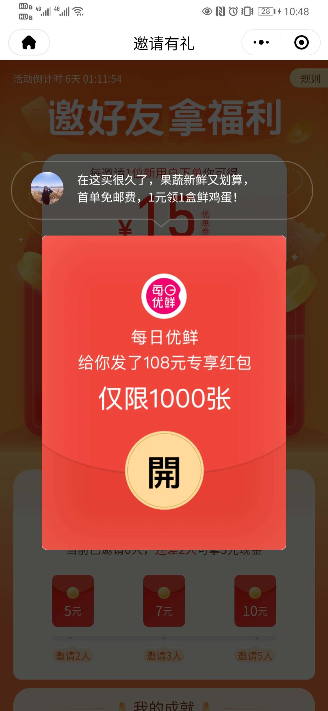 点击好友分享的链接——授权每日优鲜—弹屏新人专享券15元,有效期14天——点击立即使用——活动详情页面——再弹出领取108元新人礼包——下单