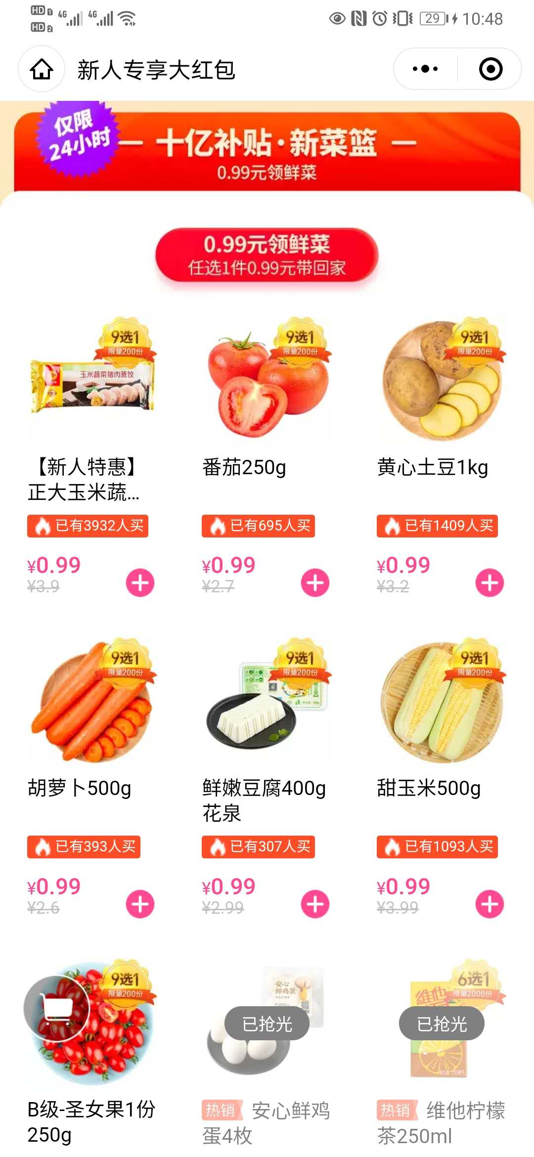 (2)0.99元领鲜菜:专门设置了新人专享区,0.99元可选择一盒鸡蛋/胡萝卜等等,对于一个新用户来说充分满足了占便宜的心理,用不到1元钱把东西买回家。
