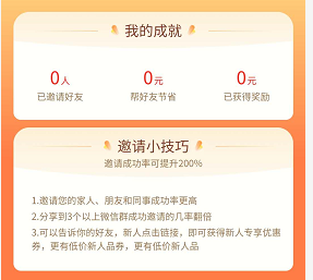 日常的邀请活动中,我们比较常见的是好友下单的金额,或是好友下单的笔数,我们在邀请页面可看到,这里写得是帮好友节省多少元,这也体现出平台的邀请好友活动体现出是一种好友间互帮互助的理念,而不是赚钱理念。