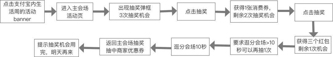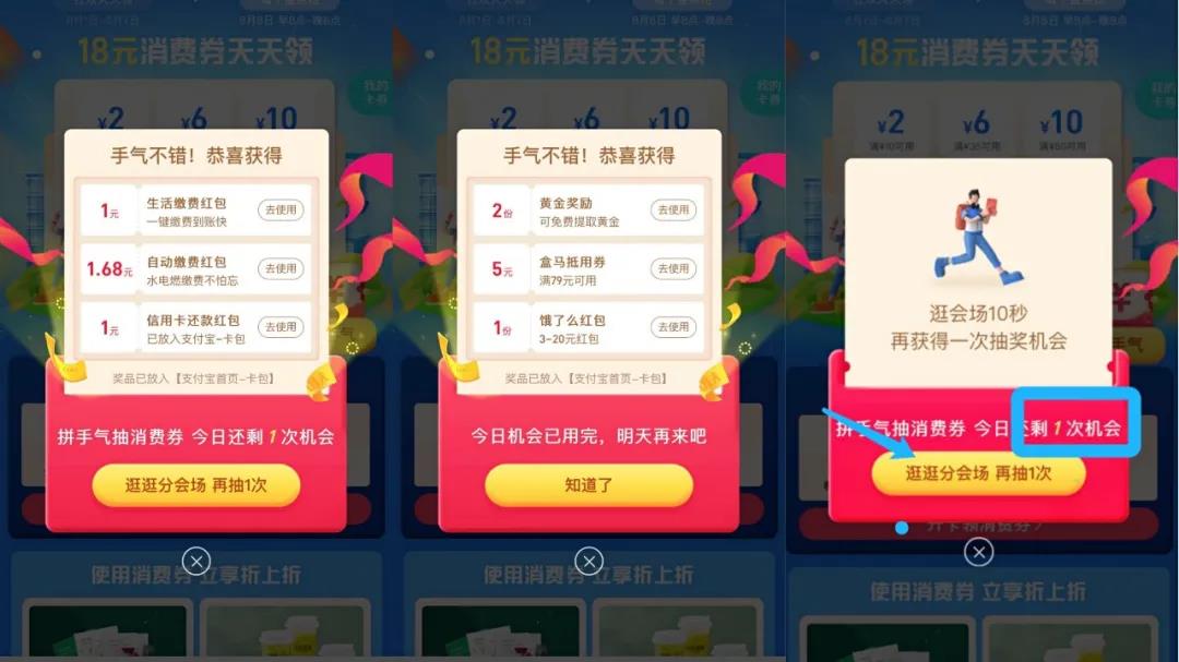 b、第二第三次抽奖可想而知,不会再赤裸裸送钱了,送的就是支付宝自己业务的抵用红包、合作商家的优惠券,所以这里的策略一个是给自己业务带量,一个是给合作商家带量。