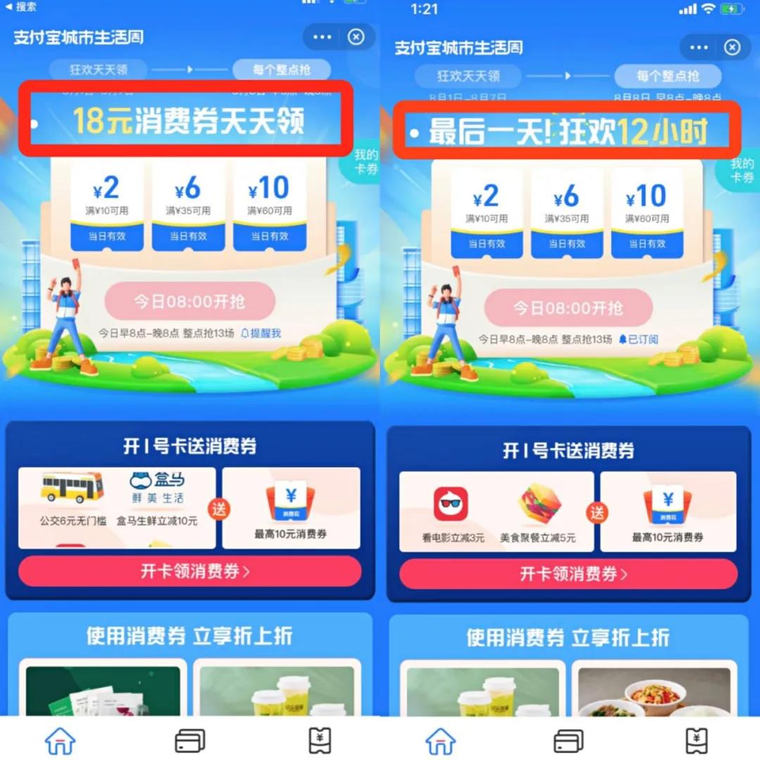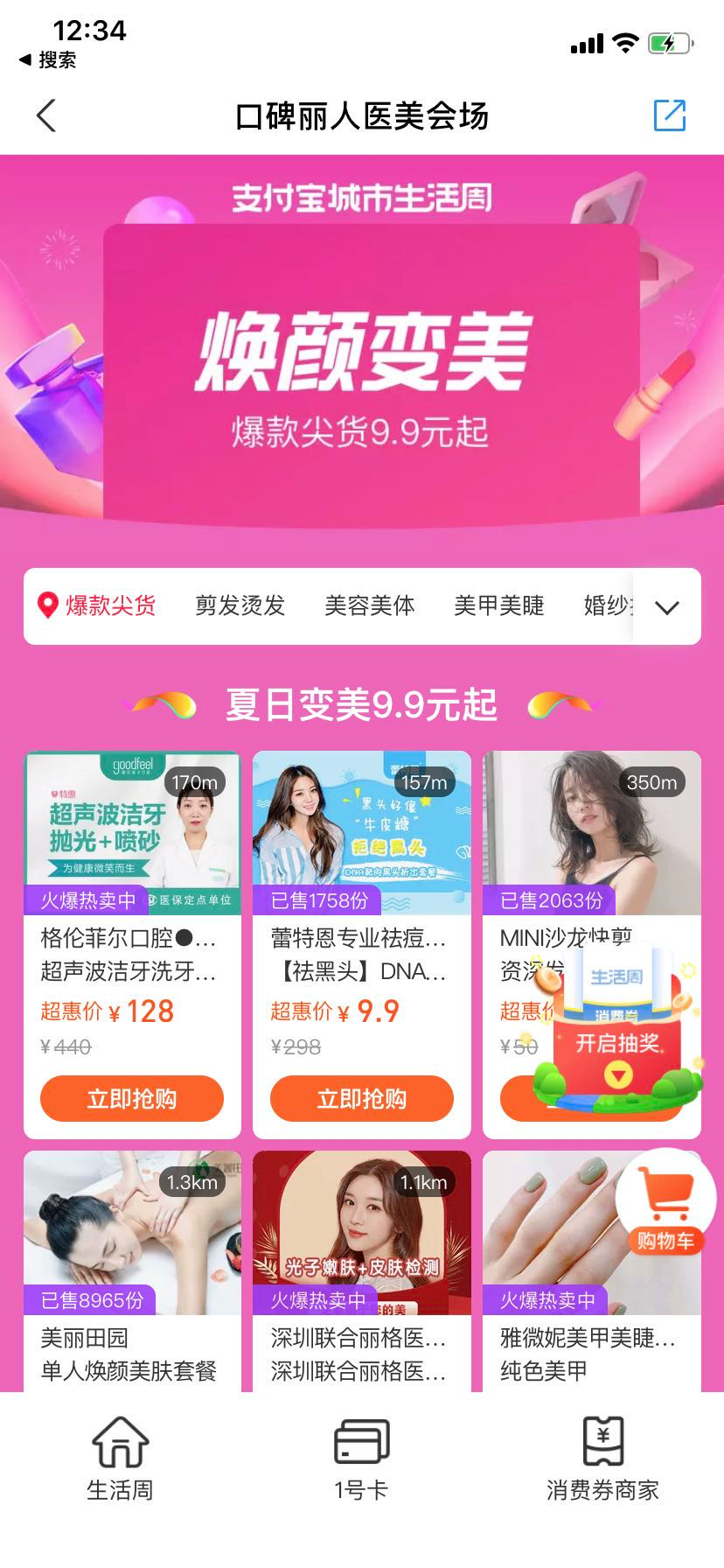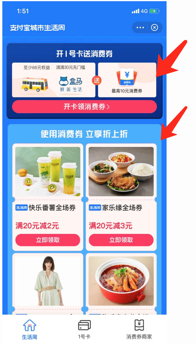 (5)消费券秒杀模块底下,紧跟着就是1号卡开通模块和消费券可用商品推荐。