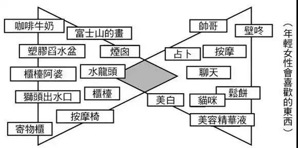 接着,他在右边的三角形写出了目标人群(年轻女性)可能会喜欢的东西: