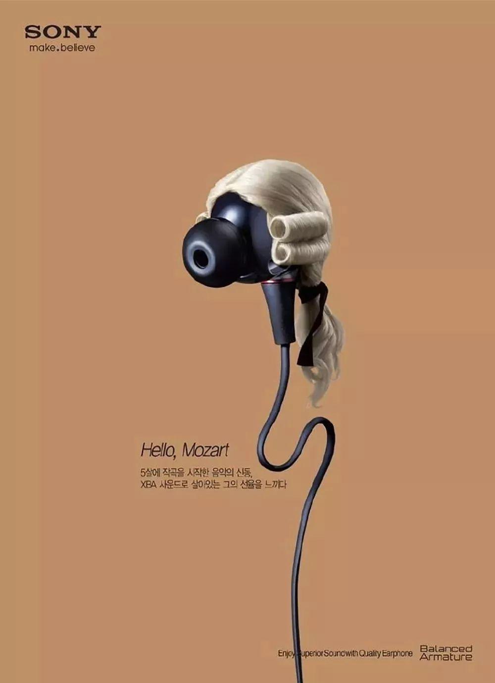 再比如索尼耳机的创意广告,就是把耳机与人组合,戴上耳机就像是真人在你身边说话:声音真实,没有杂音。