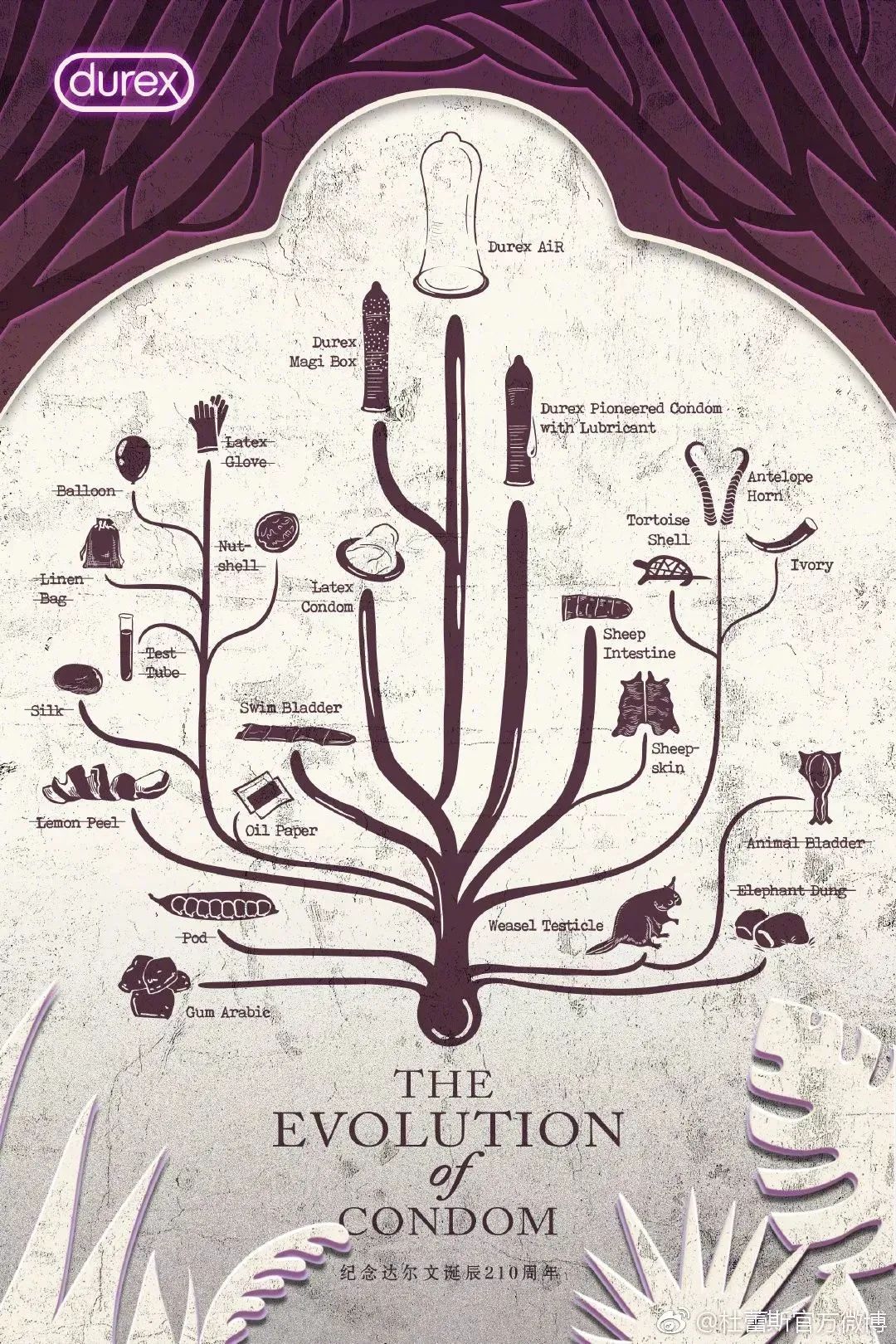 杜蕾斯创意广告,把杜蕾斯的产品与达尔文进化论的图像组合起来:这可真是够持久的,漫长地像过了数个世纪。我真服气了。