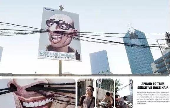 鼻毛修剪器的创意广告,把男人的鼻毛与大街上的电线组合起来:还不赶紧修剪修剪吗?