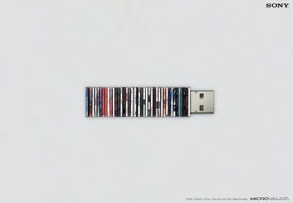索尼的这个创意广告,把U盘的存储功能与过去的CD组合起来:一个小小的U盘抵得上一大堆CD,新时代来啦!