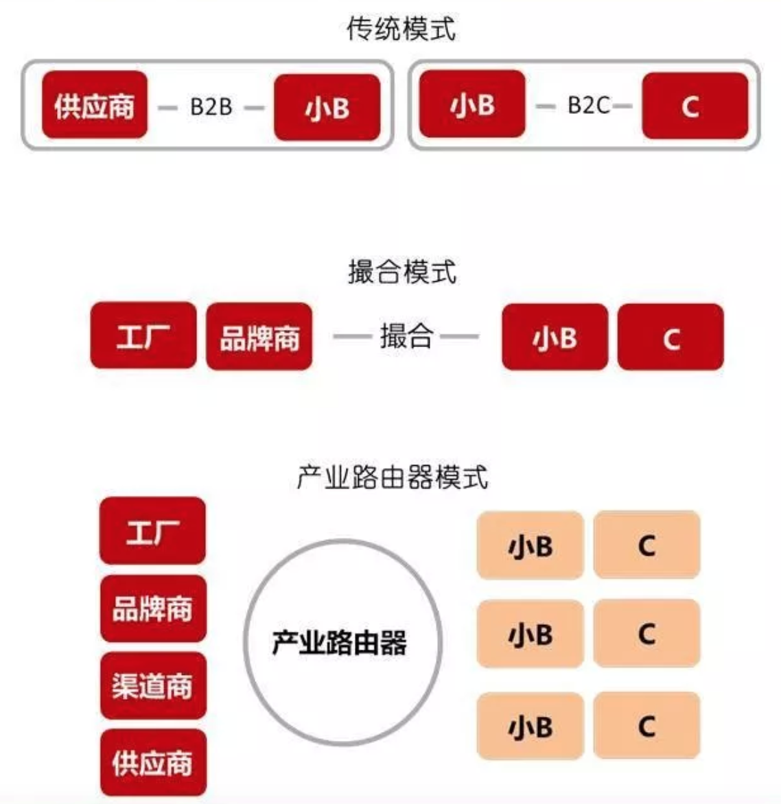 7-11没有自建的工厂和物流中心,但它构建了产业路由器形态(模式见下图),利用大量的产业链数据和智能算法形成智能配对,将177家工厂、157个配送中心和三万家便利店门店连接起来,利用产业路由器的商业模式共享研发、共享采购、共享物流、共享IT、共享金融,最终形成一个极深的价值洼地,不断地积累B端和C端的用户。
