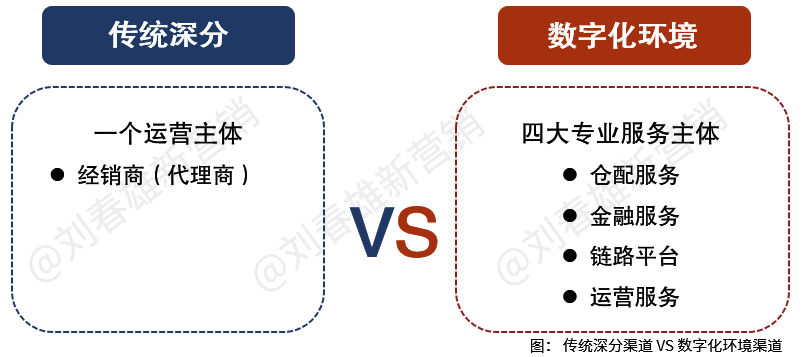 传统深分,渠道只有一个运营主体——经销商(代理商);数字化环境下,渠道形成了四大专业服务主体——仓配服务、金融服务、链路平台、运营服务。