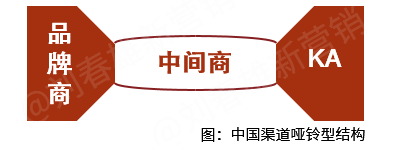 中国渠道是哑铃型结构:品牌商和KA规模大,而中间商规模小。