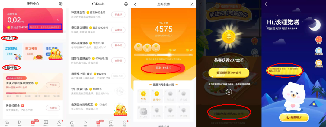 任务中不断强化金币的概念,弱化现金的存在,这样用户在每次任务时,由于获得的金币都是按100计数,潜意识会觉得奖励比较大,因此积极参与到任务中。(ps.头条并不展示金币和现金的具体汇率,如果用户不特地去留意计算的话,是不知道的)
