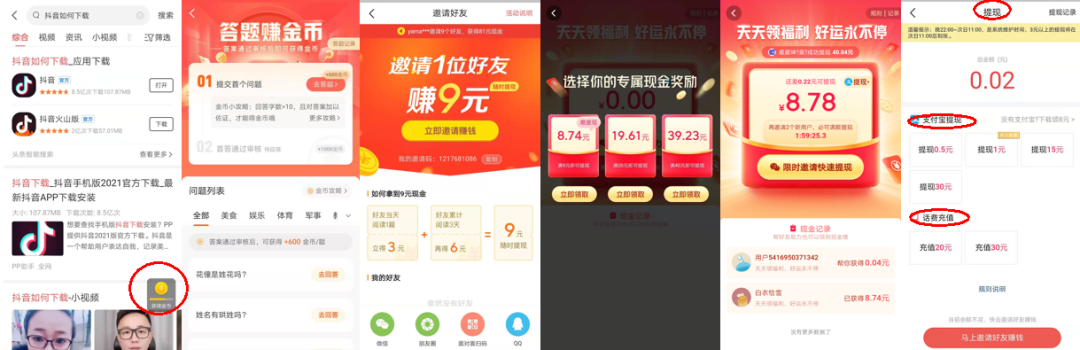 用户通过不断完成任务获得金币,金币次日会自动兑换为现金,达到提现额度后,用户可以提现。