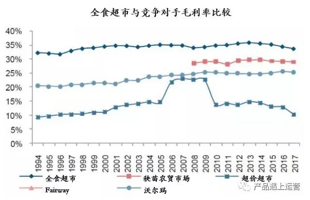 商品的健康化和高端化定位,不但作为锚点牢牢扎住了消费者的心智,同时也为高毛利提供了空间。从下图我们可以看出,Whole Foods的平均毛利远超竞争对手。