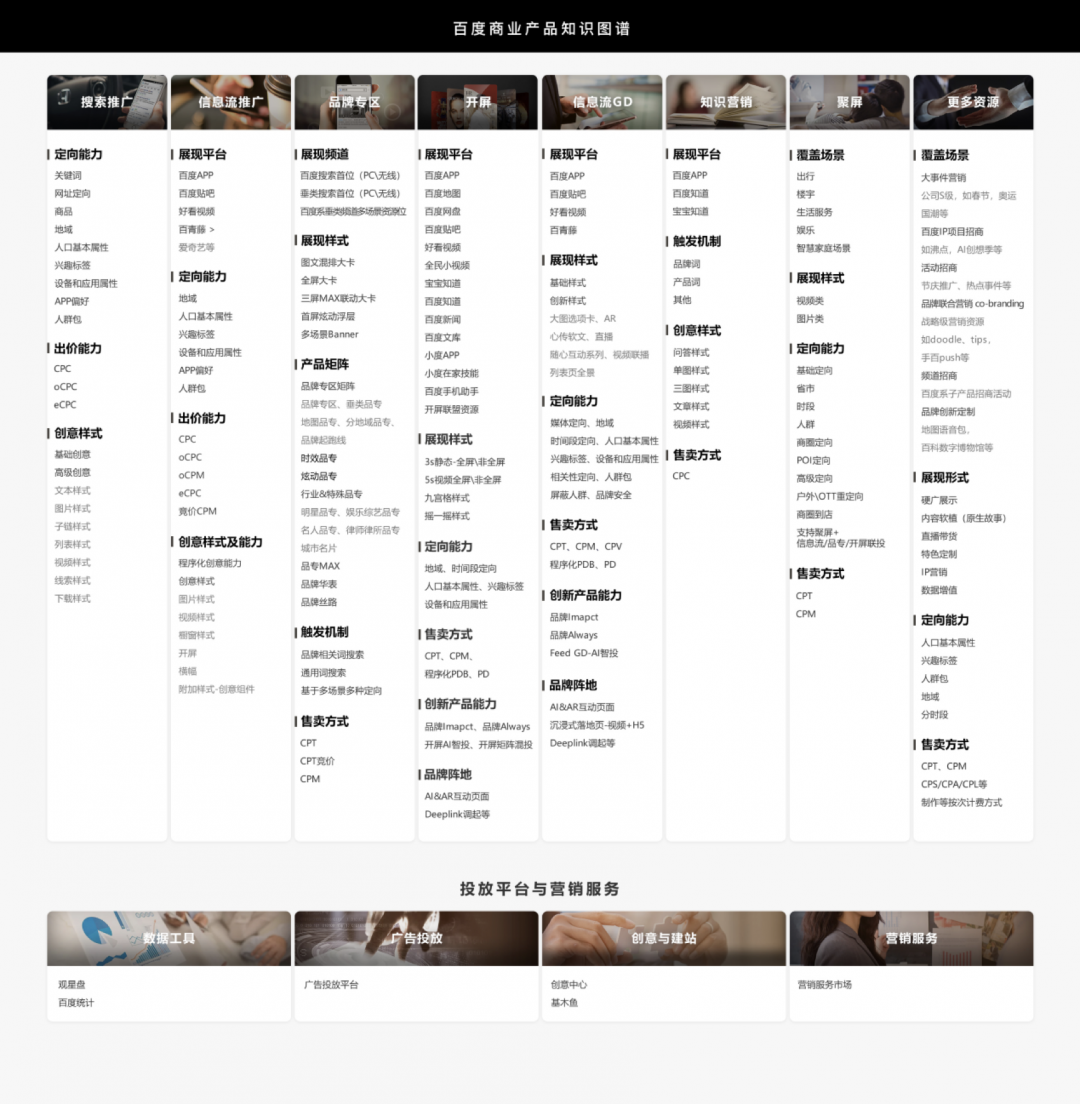 百度搜索竞价的产品有:关键词推广、网页地址(也就是行业定投)、爱采购、知识营销、阿拉丁、通用词品专等,还包括一些品牌广告。