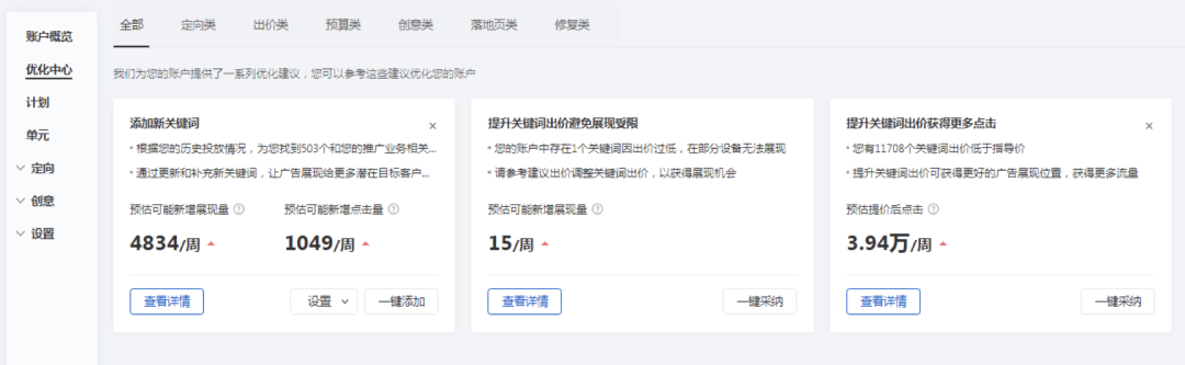 如果你的账户没有量,第一环就是物料过少,建议先扩充物料。关键词加词可以通过关键词规划师,网页地址和词包都可以通过后台去扩。