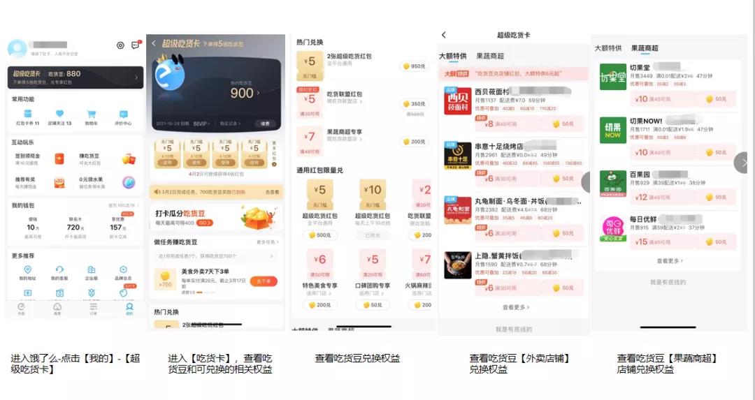 2)兑换通用的权益的比例大概是1:100,1元兑换需要100吃货豆,兑换商超或大额特供比例约等于1:10,超级吃货卡下单得100吃货豆,连续下三单得700吃货豆,提升用户连续下单,普通吃货卡下单得20吃货豆,我们在控制积分类兑换门槛的时候,需要思考每个任务能够得到积分的数量,以及积分消耗的比例
