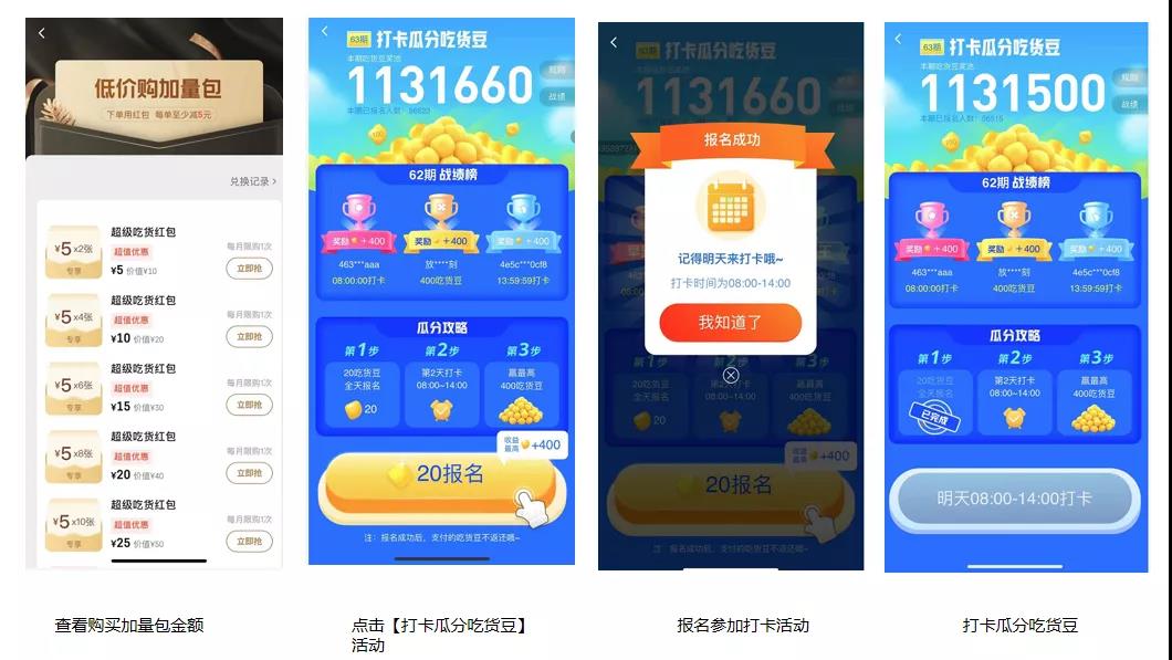 且打卡任务是有门槛的打卡,需要花费20吃货豆投入,无论参与不参与打卡瓜分,20吃货豆都不会退回,因此人们都有损失厌恶的心理,更能调动用户来参与这个游戏。