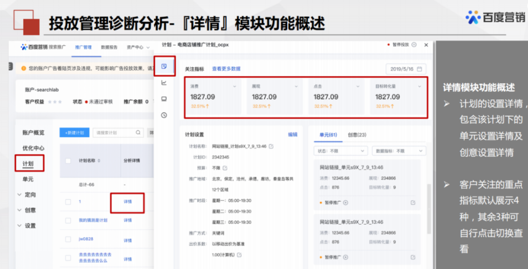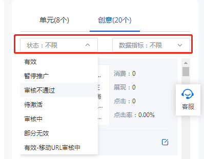 可以看到该计划的所有单元以及创意的状态和数据选择。对于单个特定或重点的计划,可以起到快速查询数据与状态的作用。
