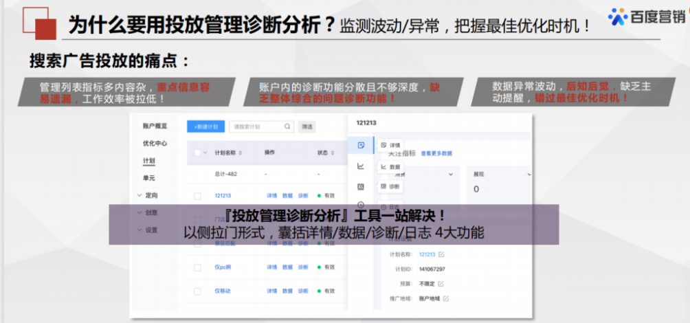 2020疫情年过去以后新的一年的Q1季度,百度已经陆续升级了很多功能来应对新的一年的流量深化。今天和大家说说百度系统更新的功能——投放管理诊断分析。