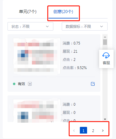 另外,值得注意的是:创意数量是默认每页20条,不足20条的则显示具体创意数量,并非计划内只有20条创意,这容易引起误导。