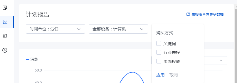 计划层级的数据简易报告,已经可以按照分日,分周,分月查看,同时选择更多选项的时候,可以选择关键词和行业定投等维度,但是以计划的整体数据呈现的,一般建议用分日来查看该计划的每天数据情况。