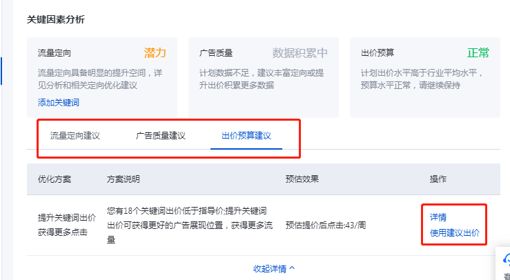不可否认,这个工具依然有很多值得总结和升级的空间。但是我们换个角度想,平时人工操作的是优化师的个人习惯,属于手动操作。系统提供的这个诊断工具,是可以帮助我们很好的去完成一些平时发现或习惯上的一些问题,可以理解为手动操作完善后,系统对账户优化的一种查漏补缺,同时联动优化中心完善账户质量的作用。如果说优化关键词是点,那使用诊断板块就是面,从效果上可以完成“点面结合”。