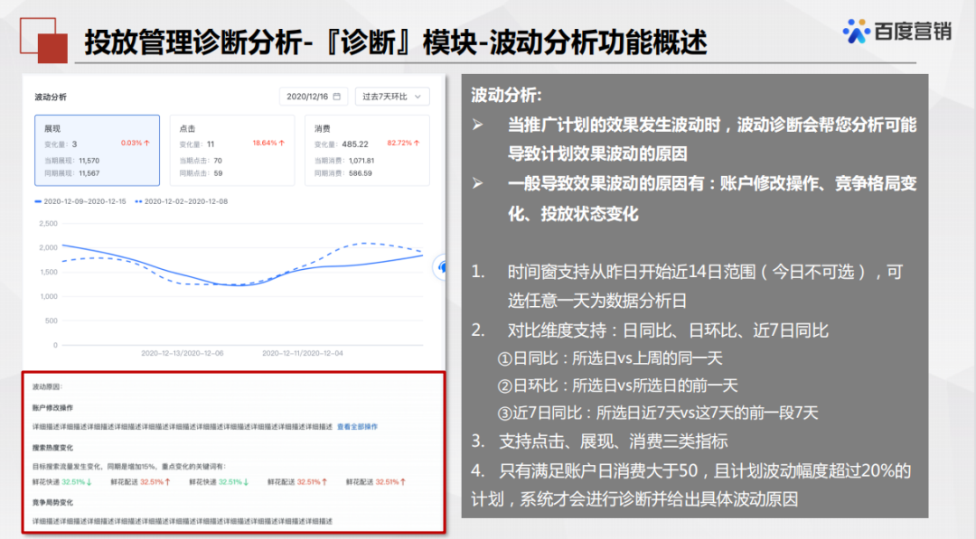 账户中对应的问题都有对应的建议,点击相应按钮可以直接跳转到对应的优化中心,按需操作使用,也属于很方便的操作细节。同时还能根据账户数据的积累,提供数据波动的情况说明和对比,有利于从大局上做更多的分析。