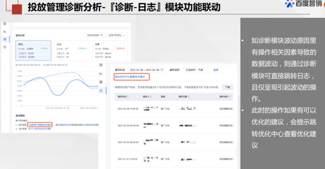 日志板块作为操作记录,同样能针对某个计划进行及时查看,同时能筛选精准的操作类型进行查看。对于部分计划数据如果积累充足,带波动分析时,能提供带来波动的操作可能性原因,一键联动优化中心进行检查和操作。