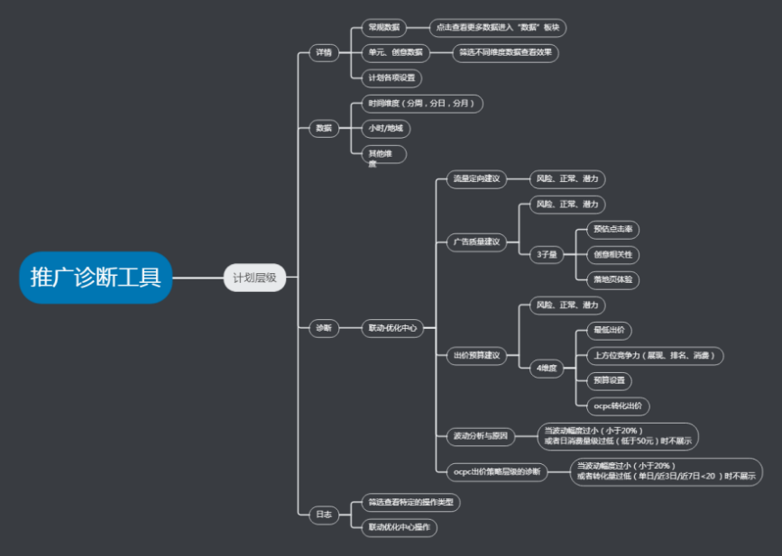 到了诊断板块,属于整个工具的核心部分,很多同学都使用过优化中心,这个工具就是连同了优化中心一起使用的,主要分三个方向:流量定向,广告质量和出价预算。