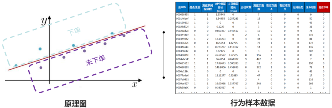 变现阶段:举一个经典的模型,我们通过历史数据对下单/未下单的用户的行为进行建模,利用逻辑回归模型预测用户下单意愿,并提高用户下单率,如下图: