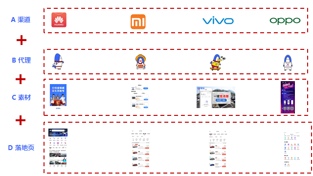 AB test(C):渠道新增素材测试,寻求最佳转化素材。素材我们有N种方法,最终得到C3这个素材是新增转化率最高的素材,那么我们就以为大功告成了,所有渠道、代理商都用C3素材,如果这么做我们是不是就是井底下,尝试哪种弹跳方式跳的最高的青蛙,但是我们跳出井底,会看到新增转化不单单是素材决定,其中包括产品、渠道、技术等等共同制约。