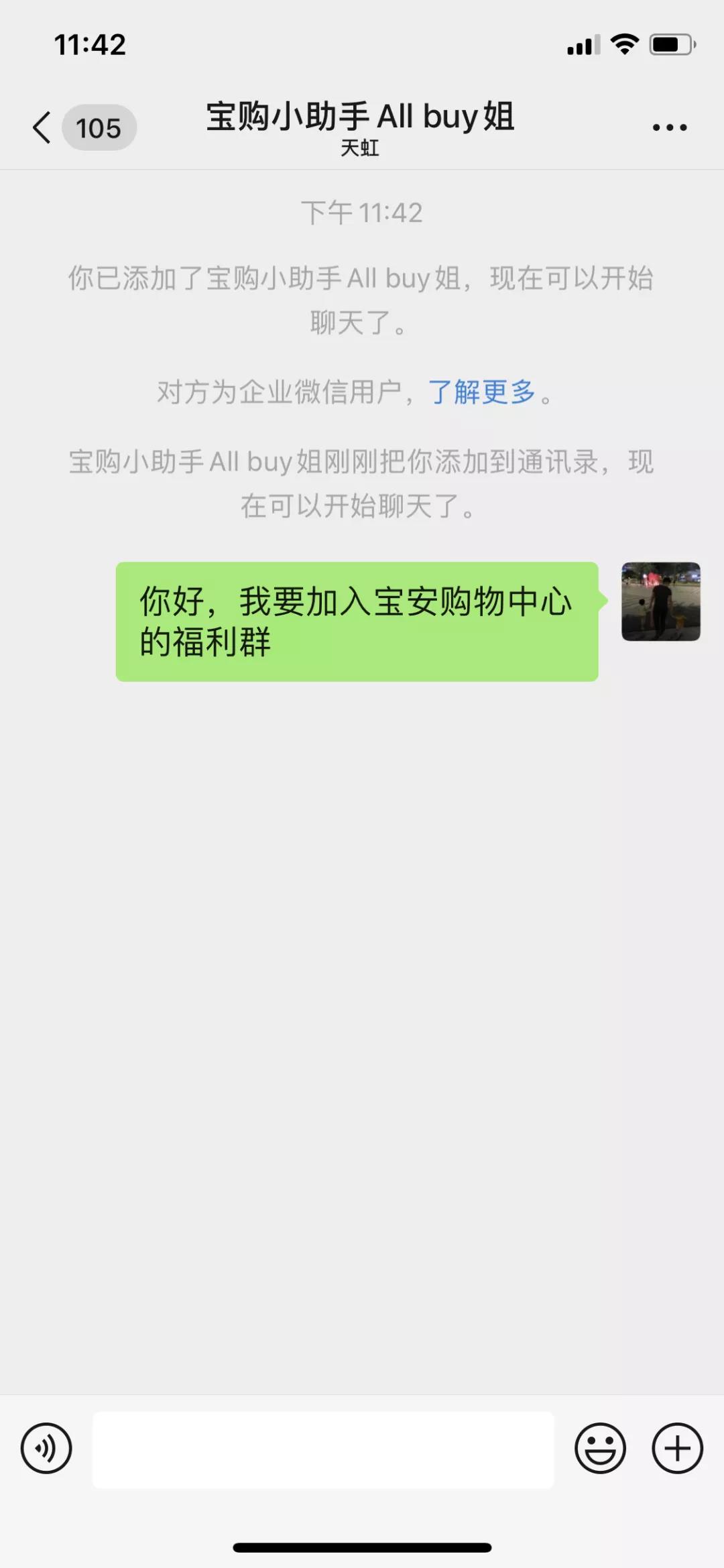 我同时扫码添加了最下方的店长小助手,立即通过申请了,这是个企业微信号,添加成功后没有收到任何的回复,也许是添加的比较晚,小助手休息了。基本上在这一步也没有及时入群成功,在这一步也会流失掉一部分的进群用户。