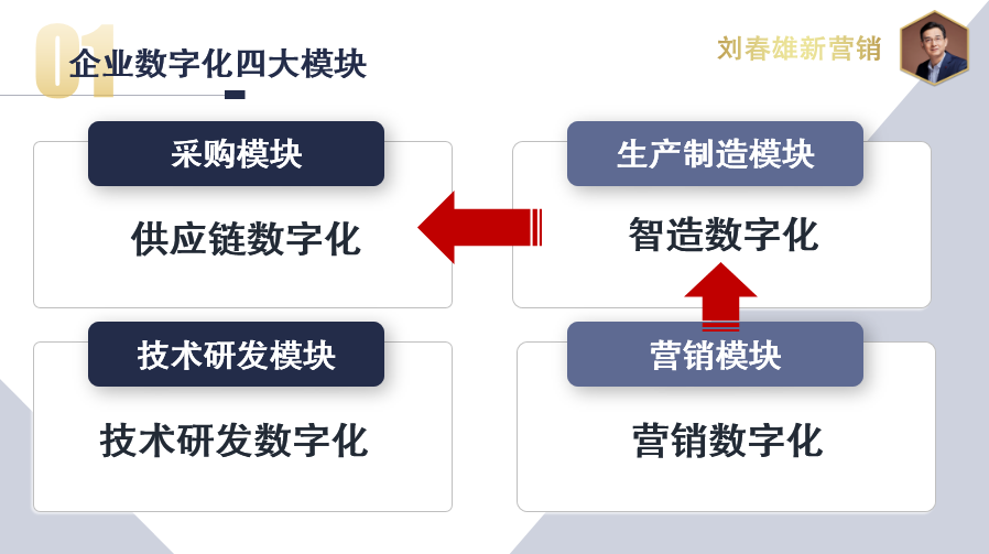 根据企业的功能模块,数字化包括四大模块:供应链数字化(采购模块)、智造数字化(生产制造模块)、营销数字化(营销模块)、技术研发数字化(技术研发模块)。