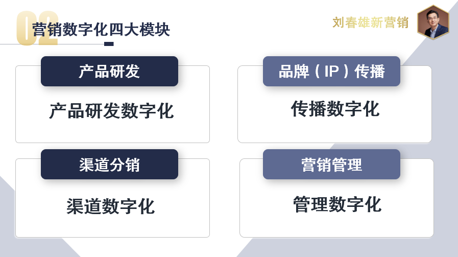营销本身就四大模块,分别是产品研发、品牌(IP)传播、渠道分销、营销管理。与之相对应的,也有四大数字化模块,分别是产品研发数字化、传播数字化、渠道数字化、管理数字化。