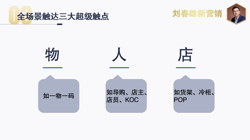 - 全场景触达,有三大超级触点。分别是以物为触点,通过一物一码方式实现触达;二是以人为触点,通过店主、店员、导购实现触达;三是以店或店内标志物(如货架、POP)为触点。