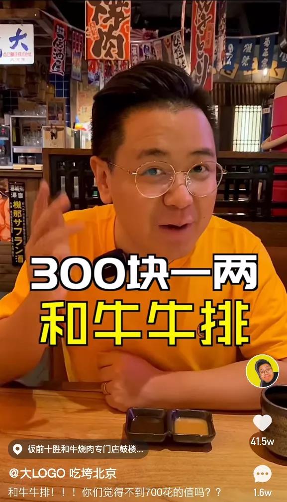 2020年6月27日,“300块一两和牛牛排”的视频爆红,点赞量近百万。原本只是为了给摄影师庆生而顺便录下的视频,却得到了如此出人意料的反响。欣喜之余,大LOGO也是看到了这个账号未来的方向——“贵”。