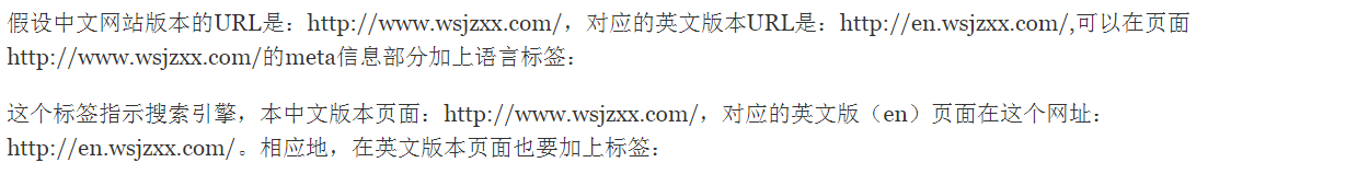 有多个网站版本针对不同国家/地区,使用不同语言的用户时,可以在页面meta部分加上语言标签:rel="alternate" hreflang="x",帮助搜索引擎辨别页面是针对哪个地区、哪个语言的,用户搜索时返回最合适的版本。