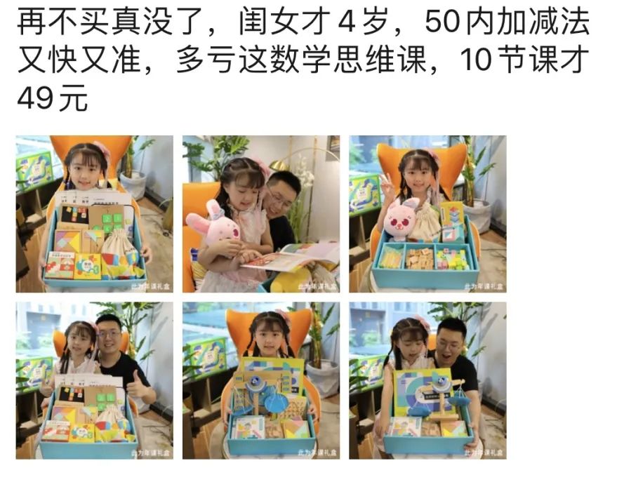 看惯了k12教育公司“大手笔”的家长也对细节颇为关注。上图的素材中,家长和孩子一起其乐融融地将礼盒拆开,通过演绎生活场景展现礼盒的吸引力和价值。