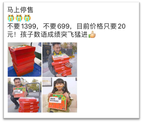 这个素材中,“马上停售”搭配大哭的表情,为受众制造紧张的氛围。而后使用了1399、699以及20这三个数字,凸显价格的优惠力度,增加了文案的情绪感染力。