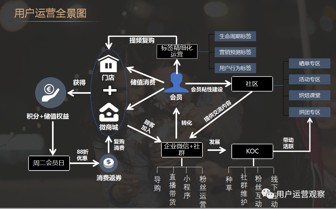 接下来要实现的是用户的闭环构建,即线上-线下的流转。流量池用户通过直播、社区、KOC的运营方式导入至线上小程序,顾客下单选择自提或者外卖方式,自提顾客回流至门店。门店相应做储值活动,将到店顾客最终转化为储值会员,实现终极的留存增长。