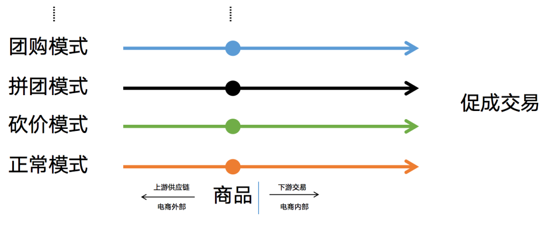 围绕商品做面,代表多种供货形式和售卖模式,比如砍价,拼团,团购等销售模式等增加,让多条线形成了面。不同的供货形式形成了新的面,最终核心目标仍然是促成交易。