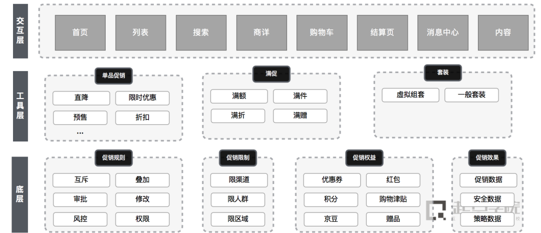 前者是小白必须要深入学习的内容,用价格工具降低商品价格,我们一般称之为营销系统,比如下图。就是营销系统的架构。营销系统的主要作用是给商品设定促销配置,包括常见的直降,预售,满减等等,给用户优惠的价格。