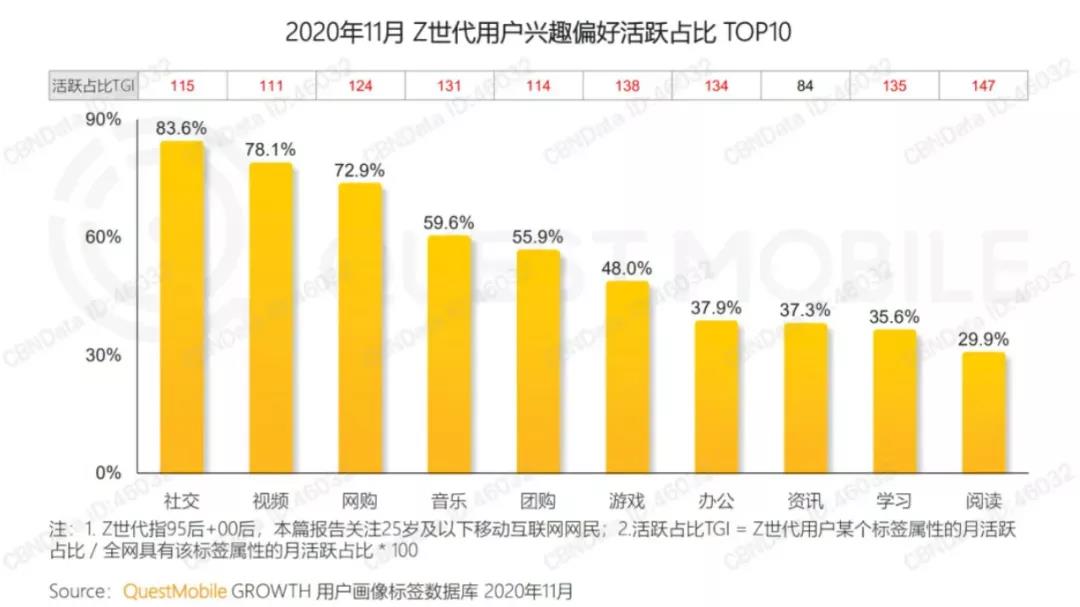据QuestMobile数据显示,Z世代用户兴趣偏好活跃占比TOP10中,有83.6%的人群对社交有着浓厚的兴趣而占据了TOP1的位置,而网购以72.9%位列TOP3。