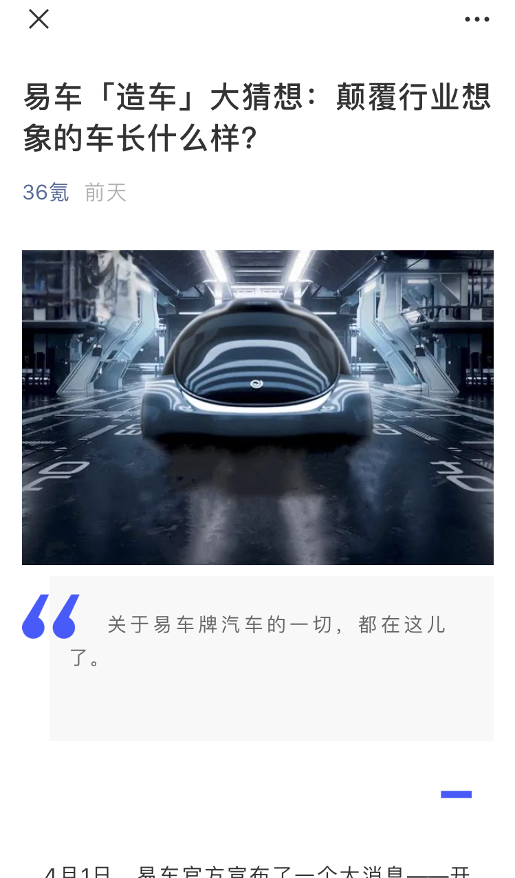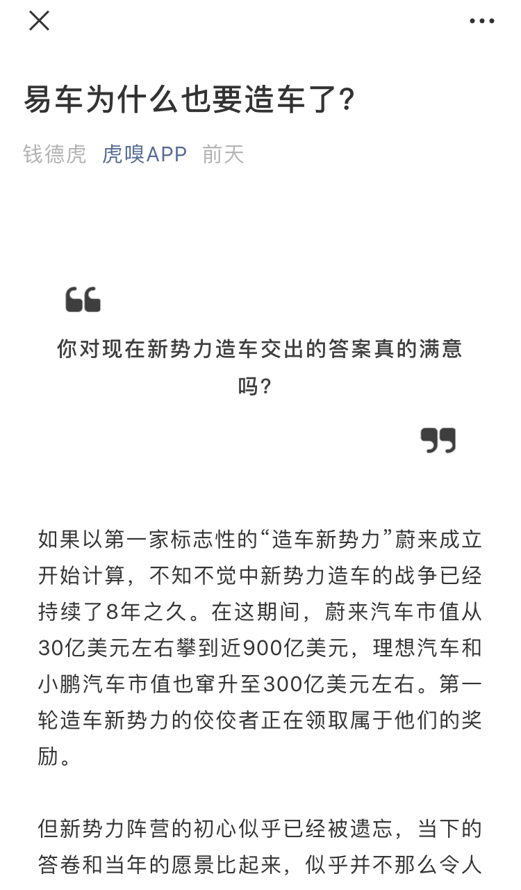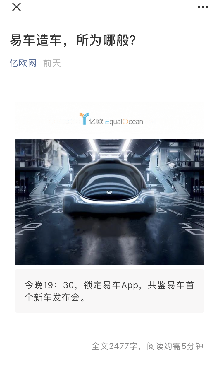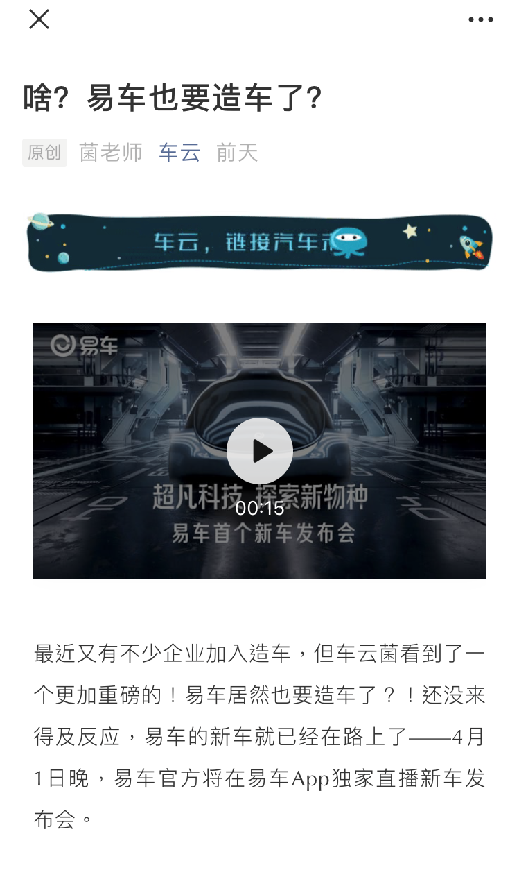 今年以来,新势力造车大放异彩,在互联网公司造车新势力里,百度已躬身入局,雷军也在前几天发微博表示小米智能电动汽车项目已正式立项。作为汽车互联网垂直领域的"课代表",易车在这个时机曝出"造车"的消息,立即引来了亿欧、车云网、第一电动、电动邦、36氪、虎嗅等科技、汽车媒体纷纷报道,以及近百知名车圈KOL的关注和朋友圈发声。