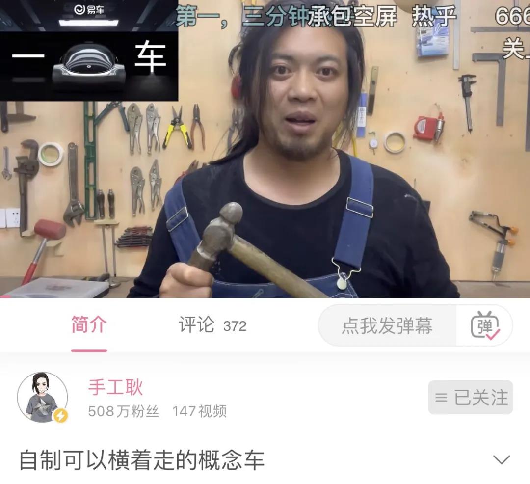 就在大家以为"一车"只是易车在愚人节博君一笑的时候,"发明界的泥石流"手工耿却在B站上喊话易车,有梗想要试试造出"一车",没过两天就在B站上放出了制作"一车"的视频,手工耿跟进视频上线后,发布一小时内,冲上B站热门榜第一。易车和手工耿的梦幻联动延续了愚人节的话题热度,更重要的是曾经创作出不锈钢 "脑瓜崩"、"加特林机枪"、等创意"发明"的他,凭借脑洞和趣味性的内容一直在B站、抖音、快手等坐拥众多粉丝。